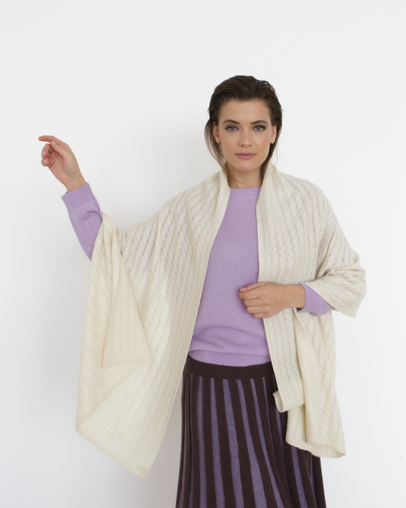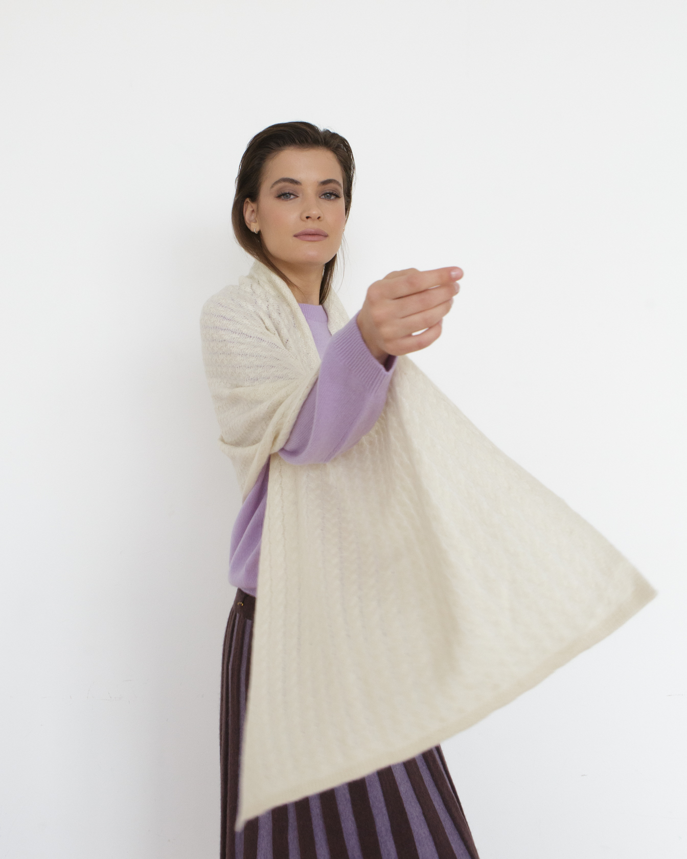 Дизайн и детали: Прямоугольная форма с аккуратной фактурной вязкой и мягкими складками. Минималистичный дизайн делает изделие универсальным и подчеркивает благородство материала.
