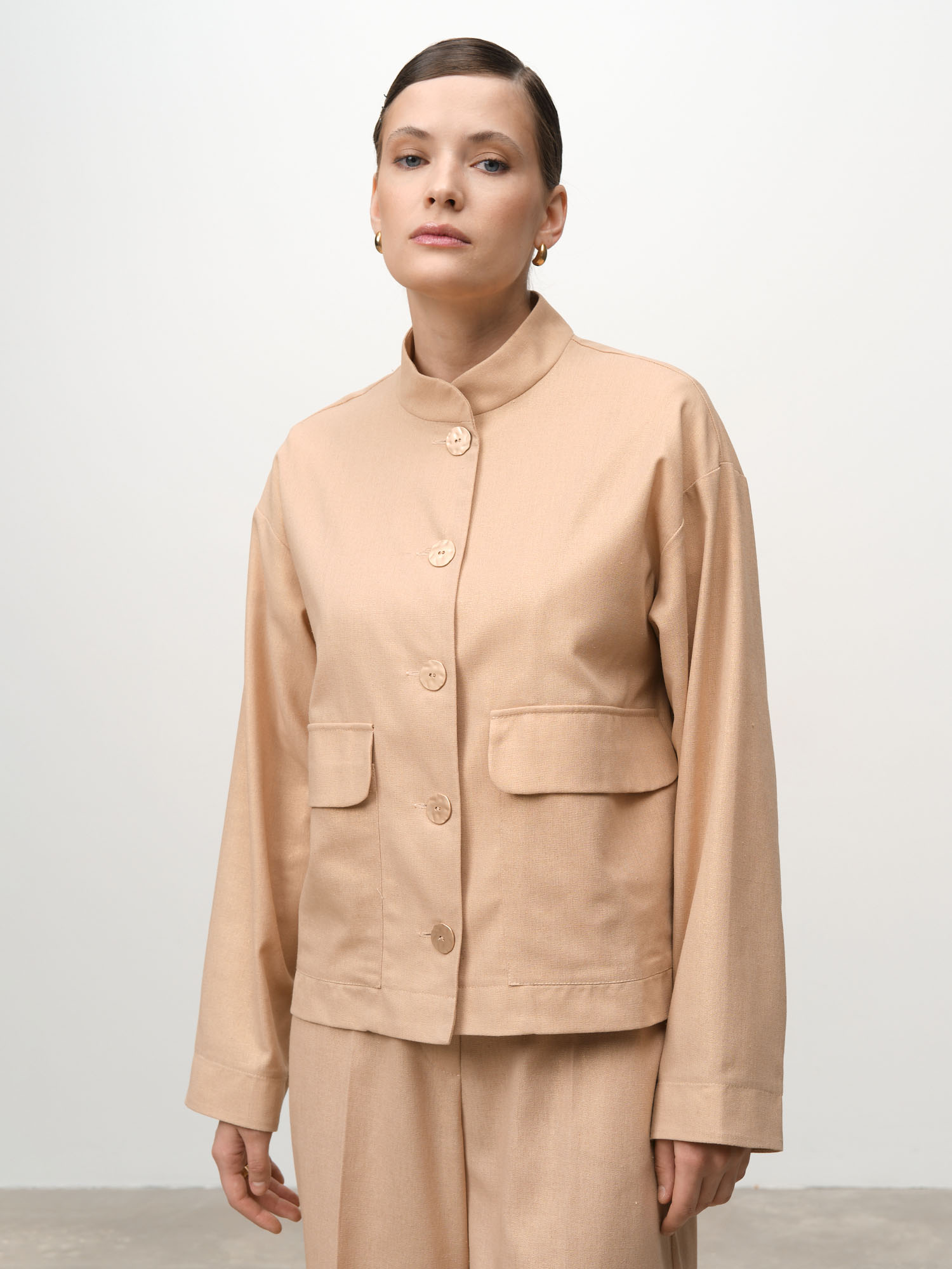 Застежка на пуговицы, накладные карманы, воротник-стойка, аккуратная обработка швов, легкая фактурная ткань.