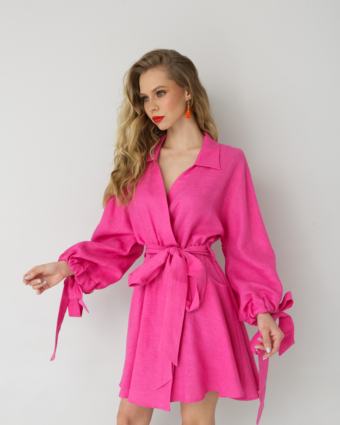 Женское льняное платье в оттенке фуксия — яркая и эффектная модель для летнего гардероба. Свободный силуэт в сочетании с поясом подчеркивает фигуру, создавая женственный и современный образ. Легкая натуральная ткань обеспечивает комфорт даже в жаркую погоду, а насыщенный цвет делает платье главным акцентом любого аутфита.