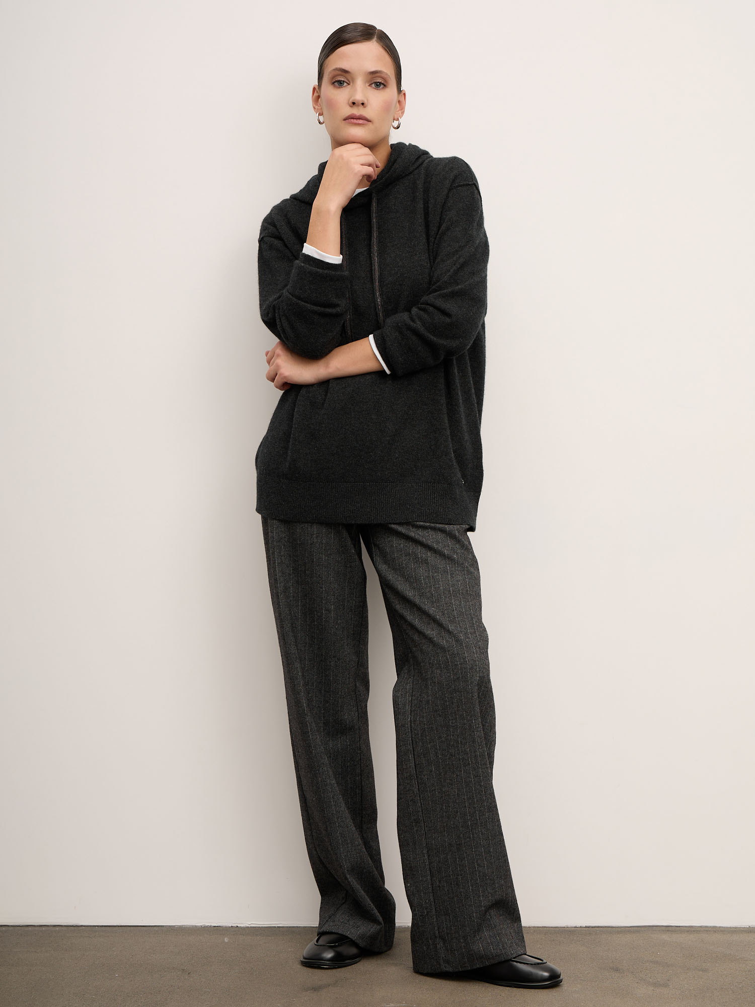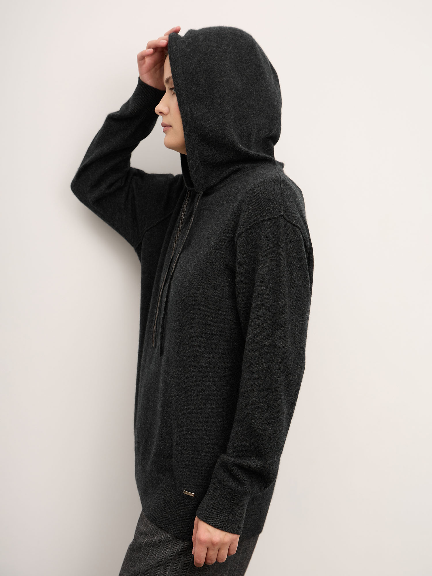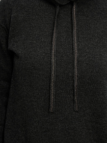 Модель выполнена с капюшоном и регулируемыми завязками, что придаёт изделию современный и расслабленный характер. Гладкая вязка подчеркивает благородную текстуру кашемира. Манжеты и низ изделия оформлены эластичной вязкой для аккуратной посадки и сохранения формы.
