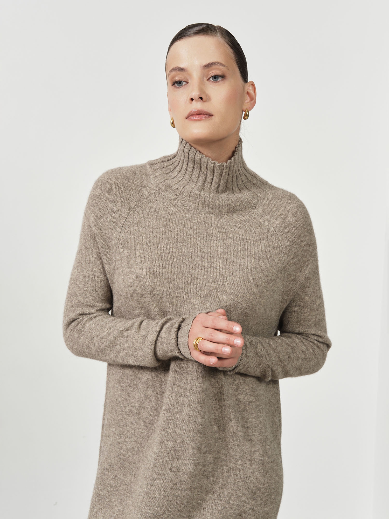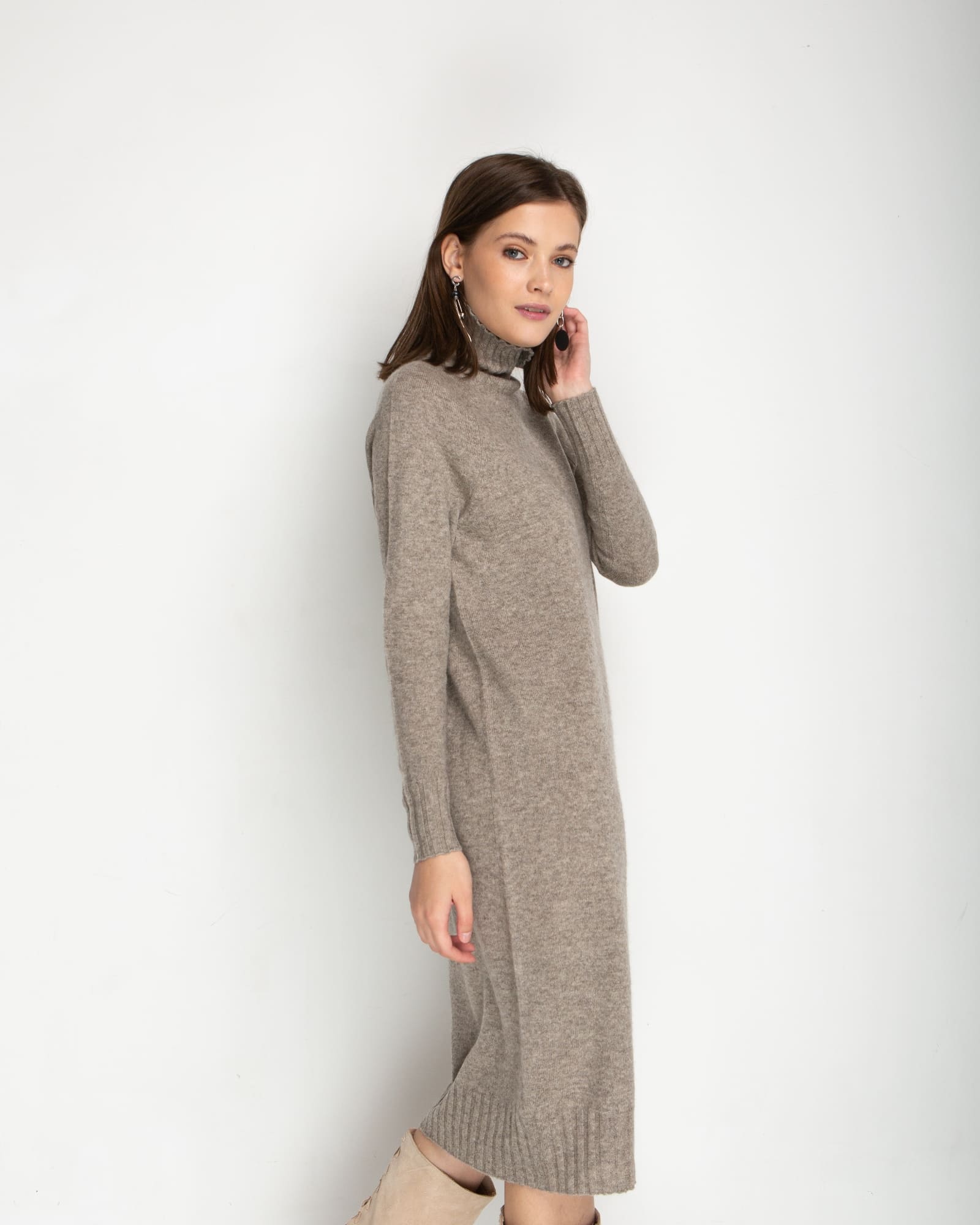 Платье из пуха яка — элегантная и уютная модель, идеально подходящая для холодного сезона. Удлинённый силуэт и мягкая фактура создают сдержанный, но выразительный образ на каждый день.