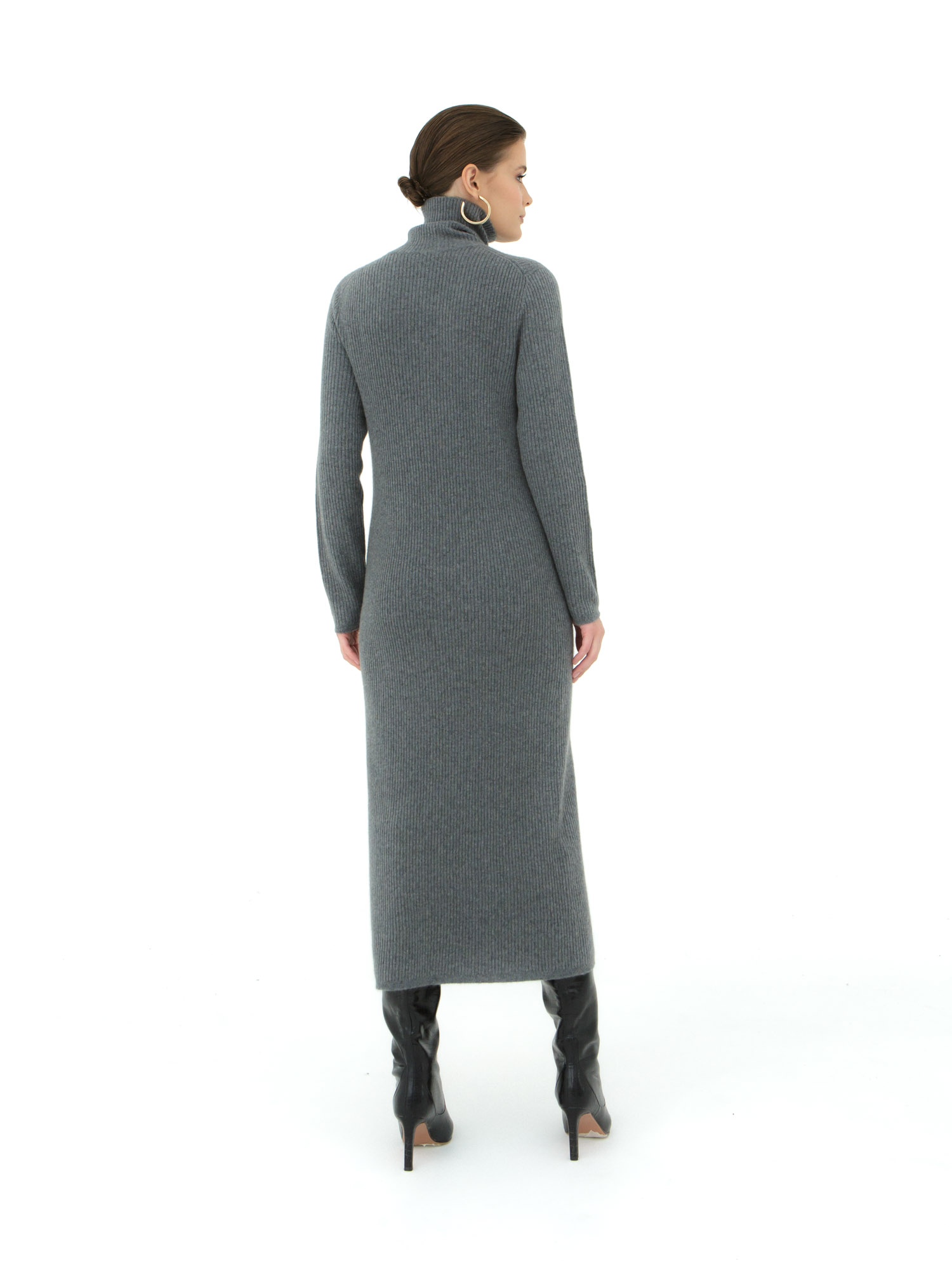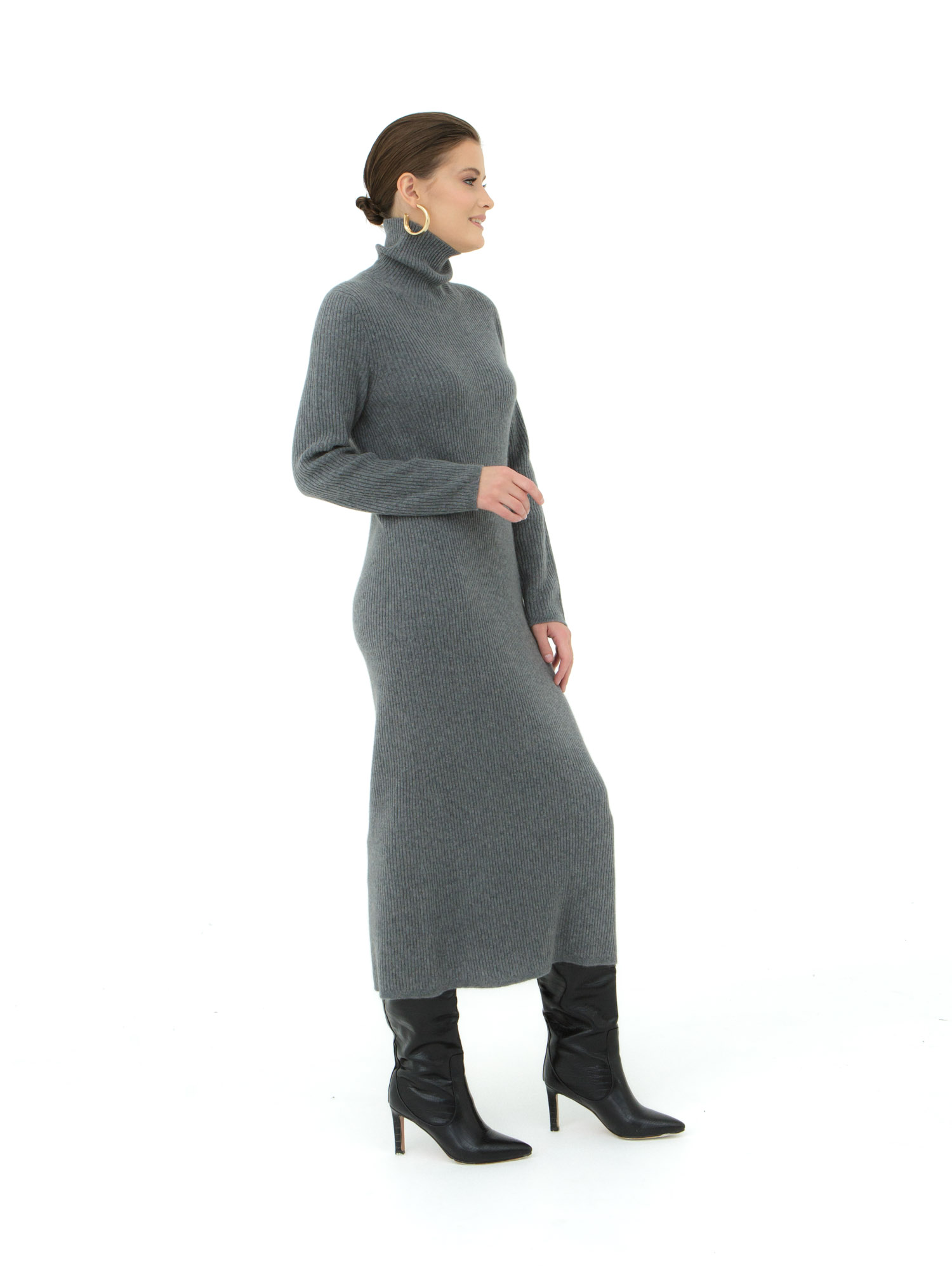 Элегантное платье из кашемира в цвете графит — идеальный выбор для холодного сезона. Благодаря мягкому и уютному материалу, это платье подарит вам комфорт в течение всего дня, а высокая горловина добавляет стиль и защищает от ветра.